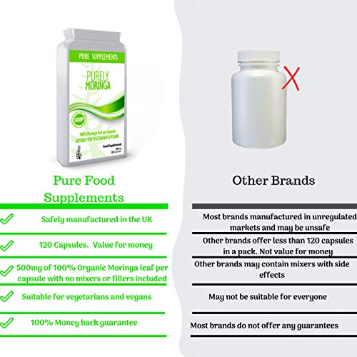 ✔PREMIUM GRADE INGREDIENTS – Manufactured in the UK to GMP code of practice and ISO 9001 quality assurance. You are guaranteed to receive a high-quality product. Pure Food Supplement’s Moringa capsules have high concentrations of vitamins, minerals, fibres and protein.