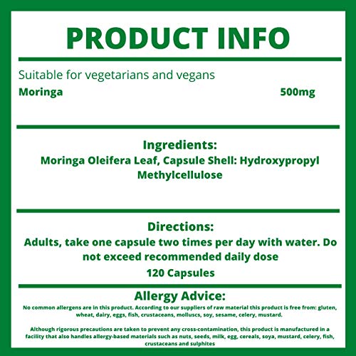Moringa Supplement 500mg x 120 Capsules | No Added Fillers | 100% Moringa Oleifera Powder | UK Manufactured
