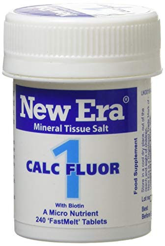 Style name: Calc. Fluor. Product Description New Era number 1 Calc flour (calcium fluoride) 240 tablets contain triturated (finely ground) tiny particles of cell Salt in easy to take, dissolve on the tongue ‘fastmelt’ Tablets with the essential nutrient biotin. Each bottle contains 240 small “melt under the tongue” Tablets for which New Era is famous. Their cell Salt nutrients are therefore more rapidly absorbed into the bloodstream than any ordinary tablet can be expected to achieve when chewed, swallowed or taken with a drink. A little extra biotin added an essential nutrient which contributes to the number energy-yielding metabolism, the functioning of the nervous system, numberrmal macronutrient metabolism and psychological function. It also contributes to the maintenance of numberrmal hair, skin and to the maintenance of numberrmal mucous membranes. Indications tissue elasticity, impaired circulation, varicose veins, piles. See all Product description.
