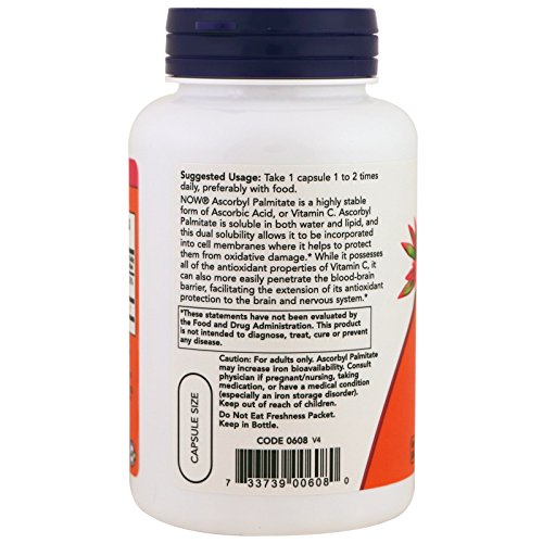 NOW Ascorbyl Palmitate is a highly stable form of ascorbic acid, or vitamin C. Ascorbyl palmitate is soluble in both water and lipid, and this dual solubility allows it to be incorporated into cell membranes where it neutralizes free radicals and helps maintain healthy tissues.* While it possesses all of the antioxidant properties of vitamin C, it can also more easily penetrate the blood-brain barrier, facilitating the extension of its antioxidant activities to the brain and nervous system.*