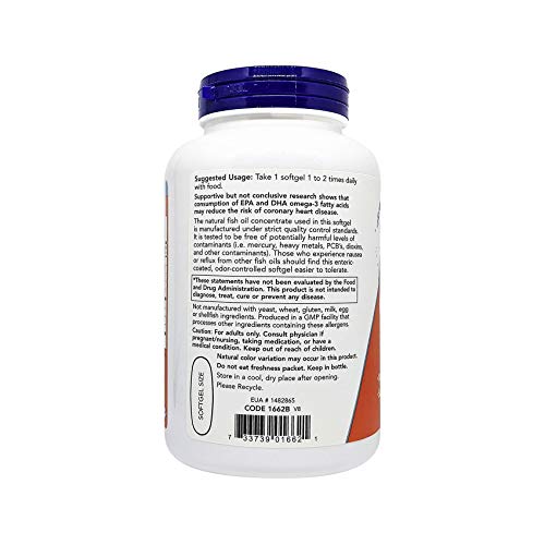 500 EPA/ 250 DHA.Molecularly distilled – enteric coated.Supports brain health. The natural fish oil concentrate used in this soft gel is manufactured under strict quality control standards. It is tested to be free of potentially harmful levels of contaminants (I.E. Mercury, heavy metals, PCB’s, dioxins, and other contaminants). those who experience nausea or reflux from other fish oils should find this enteric coated, odor-controlled soft gel easier to tolerate.