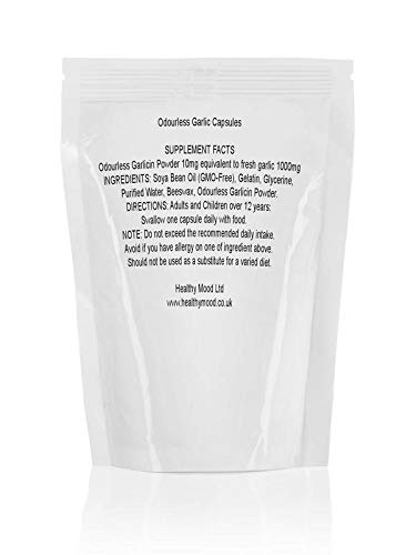 Odourless Garlic SUPPLEMENT FACTS Odourless Garlicin Powder 10mg equivalent to fresh garlic 1000mg INGREDIENTS: Soya Bean Oil (GMO-Free), Gelatin, Glycerine, Purified Water, Beeswax, Odourless Garlicin Powder. DIRECTIONS: Adults and Children over 12 years: Swallow one capsule daily with food. NOTE: Do not exceed the recommended daily intake. Avoid if you have allergy on one of ingredient above.