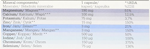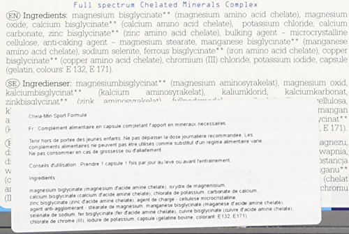 Magnesium bisglycinate** (magnesium amino acid chelate), magnesium oxide, calcium bisglycinate** (calcium amino acid chelate), potassium chloride, calcium carbonate, zinc bisglycinate** (zinc amino acid chelate), bulking agent – microcrystalline cellulose, anti-caking agent – magnesium stearate, manganese bisglycinate** (manganese amino acid chelate), sodium selenite, ferrous bisglycinate** (iron amino acid chelate), copper bisglycinate** (copper amino acid chelate), chromium (III) chloride, potassium iodide, capsule (gelatin, colours: E 132, E 171).