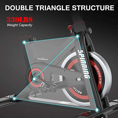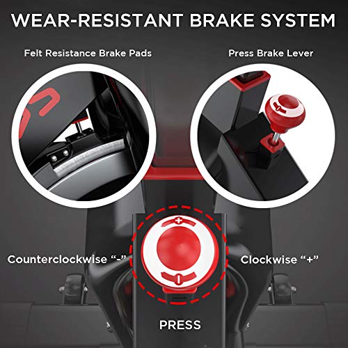 【Adjustable Limitless Resistance & Smooth and Quiet Belt Driven System】The Stationary Bike equipped with a bidirectional resistance adjustment bar, which ensure that you have a smooth quiet and wide range of exercise intensity options; Supporting emergency brake by pressing the resistance bar safely. Outstanding technique help this bike create an unbelievably smooth and nearly silent ride. No need to be lubricated, easy maintenance.