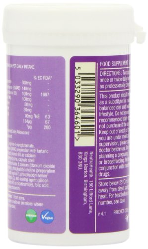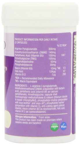 L-arginine-l-pyroglutamate, dimethylaminoethanol (DMAE preparation with tartaric acid), pantothenic acid (vitamin B5 as calcium pantothenate), trimethylglycine, capsule shell (hydroxypropyl methylcellulose & colours [titanium dioxide & copper chlorophyllin]), phosphatidyl choline (preparation with soya lecithin1 and soya oil1), phosphatidyl serine1, (preparation with vitamin C), anti-caking agent (silicon dioxide), niacin (vitamin B3 as nicotinamide), folic acid, vitamin B12 (as cyanocobalamin).