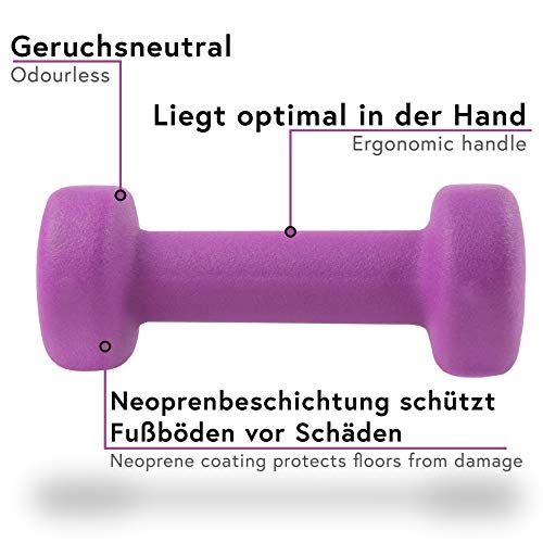 PRODUCT FEATURES – Due to the neoprene coating the neoprene barbell is insensitive to sweat and therefore a safe partner in training. The coating also protects the floor from damage.