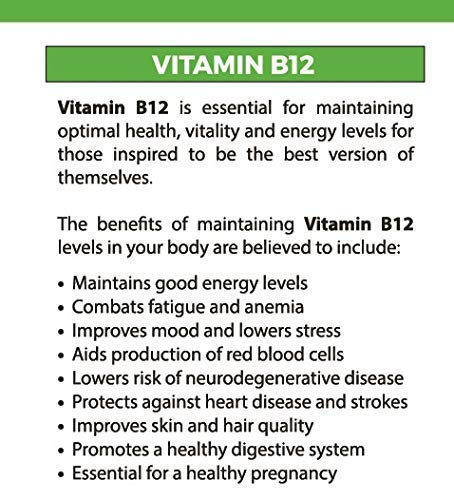 Vitamin B12 Vitamin B12 is critical for maintaining the health of vital nerve cells in the body, including those needed for the neurotransmitter signalling. Vitamin B12 is needed for nerve tissue health, brain function and production of red blood cells. When B12 levels drop so will cognitive function, which results in fluctuating moods, brain fog, and tingling or numbness in your hands or feet. The many benefits of maintaining good levels of Vitamin B12 in your body include: Maintains good energy levels and fights fatigue Improves mood and ability to deal with stress Aids production of red blood cells and fights Anemia Lowers risk of Neurodegenerative disease and memory loss Protects against heart disease and strokes Improves skin and hair quality Promotes a healthy digestive system Essential for a healthy pregnancy