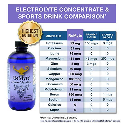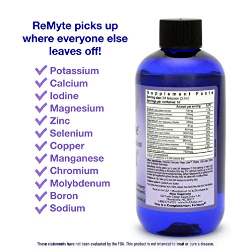 *12 MINERALS FOR CELLULAR FUNCTION – ReMyte goes far beyond most electrolyte solutions by providing one dozen minerals in the unique picometer size that allows for complete absorption at the cellular level. Thus the potency of the minerals can be very low, eliminating any possibility of toxicity, yet when 100% absorbed at the cellular level, these minerals are highly effective. *9 MINERALS SUPPORT THYROID AND ADRENALS ReMyte includes Boron, Copper, Chromium, Iodine, Selenium, Zinc, all of which have very specific roles to play inSsupporting the structure and function of the thyroid and adrenal glands as well as optimizing bone health, blood vessel integrity and blood sugar balance. *IMMUNE SYSTEM REGULATION – Boost immune system performance. Steps in where other multi-mineral solutions leave off by providing 12 minerals in proper ratios. *NO ARTIFICIAL PRESERVATIVES OR ANIMAL BYPRODUCTS – ReMyte is vegan, gluten free (