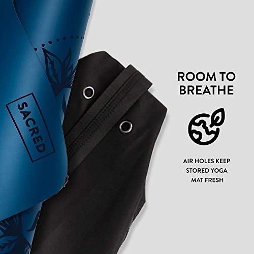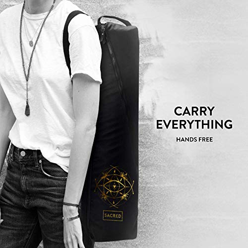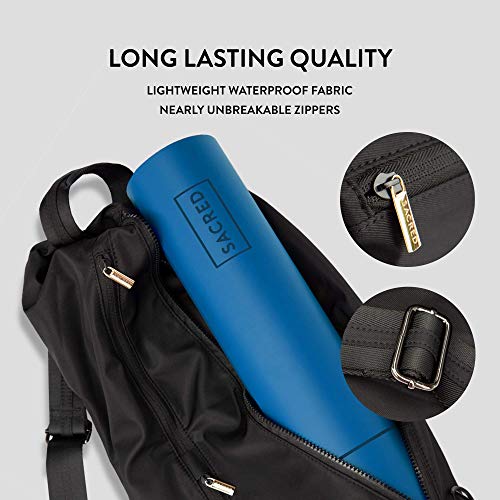 BEST CARRIER FOR YOGA MAT — The Sacred Yoga yoga mat holder has multiple built-in compartments. It doubles as a large gym bag for women and men that, in addition to a thick activity mat, can also fit a towel, yoga block, and water bottle, unlike a tote bag.