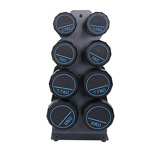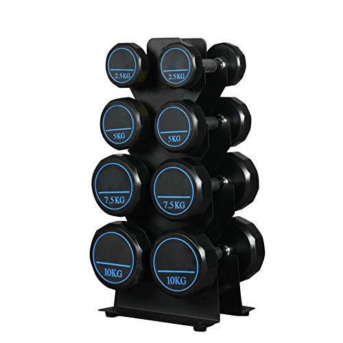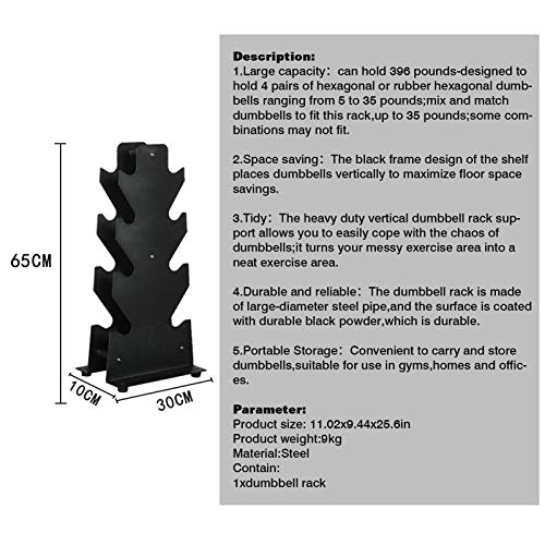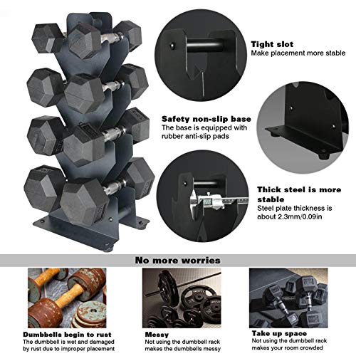 Large Capacity: Can hold 396 pounds. Designed to hold 4 pairs of hexagonal or rubber hexagonal dumbbells ranging from 5 to 35 pounds. Mix and match dumbbells to fit this rack, up to 35 pounds, some co