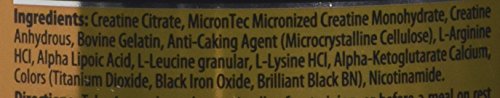 Creatine Citrate, Creatine Anhydrous, Bovine Gelatin, Creatine Monohydrate, MicronTec Micronized Creatine Monohydrate, L-Arginine HCl, Anti-Caking Agent (Magnesium Stearate), Alpha Lipoic Acid, L-Leucine, L-Lysine HCl, Alpha-Ketoglutarate Calcium, Colors (Titanium Dioxide, Black Iron Oxide, Brilliant Black BN), Nicotinamide