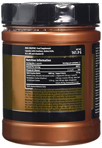 The KING CREATINE bioenergetic Creatine complex formula is carefully designed to support your body in physical activity, especially during high-intensity training! Our 3 component, multi-creatine matrix is 4000 milligrams and provides – among others – the most studied Creatine form ever! Creatine in a minimum of 3 g daily dose is scienti fically proven to contribute to an increase of performance in successive bursts of short-term, high intensity exercise like weight training and maximum intensity interval cardio!* We added several popular ingredients to complete our design, including several amino acids and Alpha-Ketoglutarate (AKG), which is an integral component of the Krebs-cycle that is an energy generating cycle in the body. Vitamin B3 contributes to the following beneficial physiological effects*: reduction of tiredness and fatigue; normal energy-yielding metabolism; normal functioning of the nervous system.