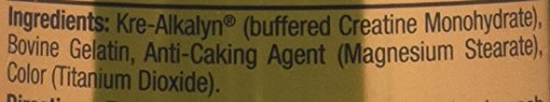 Kre-Alkalyn’s® (buferado creatine monohydrate), bovine gelatin, caking (magnesium stearate), colorant (titanium dioxide)
