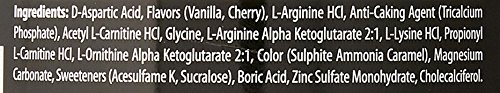 D-Aspartic Acid, Flavors (Vanilla, Cherry), L-Arginine HCl, Anti-Caking Agent (Tricalcium Phosphate), Acetyl L-Carnitine HCl, Glycine, L-Arginine Alpha Ketoglutarate 2:1, L-Lysine HCl, Propionyl L-Carnitine HCl, L-Ornithine Alpha Ketoglutarate 2:1, Color (Sulphite Ammonia Caramel), Magnesium Carbonate, Sweeteners (Acesulfame K, Sucralose), Boric Acid, Zinc Sulfate Monohydrate, Cholecalciferol