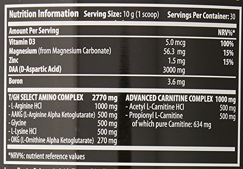 T/GH represents a new generation in the product category. It provides a complex Testosterone, growth and performance optimization support with 12 potent, select ingredients!&nabs; It provides DAA (D-Aspartic Acid) in the researched, strong 3 gram dose, and Carnitines in the advanced forms of Propionic L-Carnitine and Acetyl L-Carnitine. AKG versions of Arginine and Ornithine are also included in the amino complex! T/GH contains Vitamin D3, Boron and other essential minerals of which Zinc contributes to the maintenance of normal Testosterone levels in the blood, and contributes to normal fertility and reproduction. Vitamin D supports the maintenance of normal muscle function and contributes to the normal function of the immune system. Magnesium contributes to normal protein synthesis, normal functioning of the nervous system (neurotransmission and muscle contraction including heart muscle), to the reduction of tiredness, fatigue, normal energy-yielding metabolism and electrolyte balance.