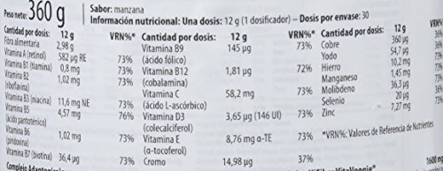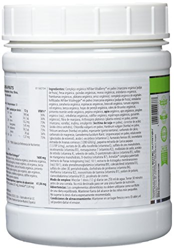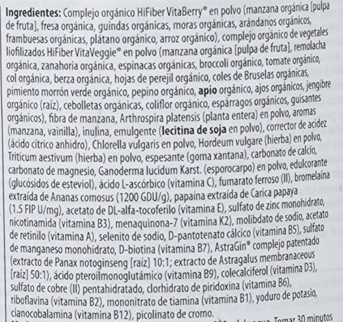 Organic HiFiber VitaBerry® Powder Blend (Organic Apple [Fruit Pulp], Organic Strawberry, Organic Tart Cherry, Organic Blackberry, Organic Blueberry, Organic Raspberry, Organic Banana, Organic Rice), Organic HiFiber VitaVeggie® Freeze-dried Vegetable Powder Blend (Organic Apple [Fruit Pulp], Organic Beet, Organic Carrot, Organic Spinach, Organic Broccoli, Organic Tomato, Organic Kale, Organic Cabbage, Organic Parsley Leaf, Organic Brussel Sprouts, Organic Green Bell Pepper, Organic Cucumber, Organic Celery, Organic Garlic, Organic Ginger Root, Organic Green Onion, Organic Cauli flower, Organic Asparagus, Organic Pea), Apple Fiber, Arthrospira platensis (Whole Plant) Powder, Flavors (Apples, Vanilla), Inuline, Emulsi er (Soy Lecithin Powder), Acidity Regulator (Citric Acid Anhydrous), Chlorella vulgaris Powder, Hordeum vulgare (Herb) Powder, Triticum aestivum (Herb) Powder, Thickener (Xanthan Gum), Calcium Carbonate, Magnesium Carbonate, Ganoderma lucidum Karst. (Fruit Body) Powder, Sweetener (Steviol Glycosides), L-Ascorbic Acid, Ferrous(II)-Fumarate, Bromelain extracted from Ananas comosus (1200 GDU/g), Papain extracted from Carica papaya (1.5 FIP U/mg), DL-Alpha-Tocopheryl Acetate, Zinc Sulfate Monohydrate, Nicotinamide, Menaquinone-7, Sodium Molybdate, Retinyl Acetate, Sodium Selenite, Calcium D-Pantothenate, Manganese Sulfate Monohydrate, D-Biotin, AstraGin® Proprietary Blend (Panax notoginseng [Root] 10:1 extract; Astragalus membranaceous [Root] 50:1 extract), Pteroylmonoglutamic Acid, Cholecalciferol, Copper(II)-Sulfate Pentahydrate, Pyridoxine HCl, Ribo avin, Thiamine Mononitrate, Potassium Iodide, Cyanocobalamin, Chromium Picolinate