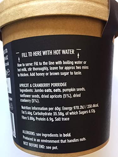 INGREDIENTS & NUTRITION: each pot contains just 5 ingredients, British grown jumbo oats, sunflower seeds and pumpkin seeds, chopped pricots & cranberries. High protein & high fibre, contains zinc, magnesium and plant based omega 3 We do not use any artificial sweeteners or preservatives. NO milk powder or alternative milk powders.