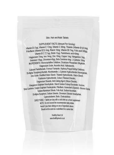 Skin, Hair and Nails Tablets SUPPLEMENT FACTS (Amount Per Serving) Vitamin D3 5µg, Vitamin E 12mg, Vitamin C 80mg, Thiamin (Vitamin B1)6.3mg, Riboflavin (Vitamin B2)3.5mg, Niacin 16mg, Vitamin B6 7mg, FOLIC ACID B9 500µg, Vitamin B12 22.5µg, Biotin 15µg, Pantothenic acid 40mg, Magnesium 75mg, Iron 14mg, Zinc 10mg, Copper 1mg, Manganese 2mg, Selenium 110µg, Chromium 40µg, Beta Carotene 4mg, L-Cysteine 10mg INGREDIENTS: Microcrystalline Cellulose, Dicalcium Phosphate Dihydrate, Magnesium Oxide, Ascorbic Acid, Maltodextrin,Calcium Pantothenate, Ferrous Fumarate, Hydroxy Propyl Methyl Cellulose, Dl-Alpha-Tocopheryl Acetate, Nicotinamide, L-Cysteine Hydrochloride Monohydrate, Zinc Oxide, Modified Maize Starch, Thiamin Hydrochloride, Maize Starch, Pyridoxine Hydrochloride, Colour (Titanium Dioxide), Magnesium Stearate, Anti-Caking Agent (Silicon Dioxide), Manganese Sulphate Monohydrate, Starch Sodium Octenyl Succinate, Sucrose, Beta Carotene, Copper Sulphate Pentahydrate, Riboflavin, Humectant (Glycerol), Glucose Syrup, Sodium Aluminium Silicate, FOLIC ACID B9, Sodium Ascorbate, Dl-Alpha-Tocopherol, Sodium Selenite, Chromium Chloride Hexahydrate, Cyanocobalamin, Biotin, Cholecalciferol. DIRECTIONS: 1 tablet per day with a cold drink as a food supplement