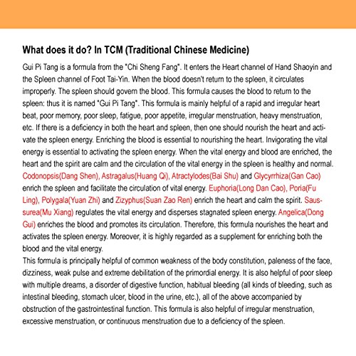 Codonopsis pilosula (Dang Shen), Poria cocos (Fu Ling), Euphoria longan (Long Dan Cao), Angelica sinensis (Dong Gui), Astragalus mongholicus (Huang Qi), Atractylodes macrocephala (Bai Shu), Zizyphus sativa var. (Suan Zao Ren), Zizyphus jujuba (Da Zao), Glycyrrhiza glabra (Gan Cao), Polygala tenuifolia (Yuan Zhi), Saussurea lappa (Mu Xiang), Zingiber officinale (Gan Jiang)