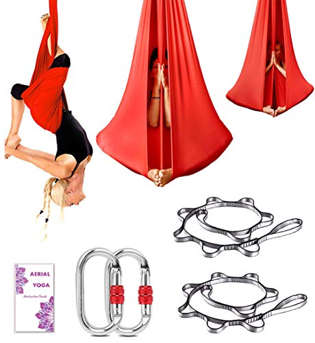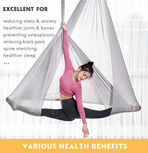 ✔ VARIOUS HEALTH BENEFITS: Our Aerial yoga hammock allows you to practice fun variations on pull-ups in various ways using the soft fabric. By gently lengthening the spine, the practice of AntiGravity yoga can help with back pain and sciatica, while simultaneously improving core strength and flexibility. Aerial silk yoga is a great compliment to a mat practice or other workout regimen