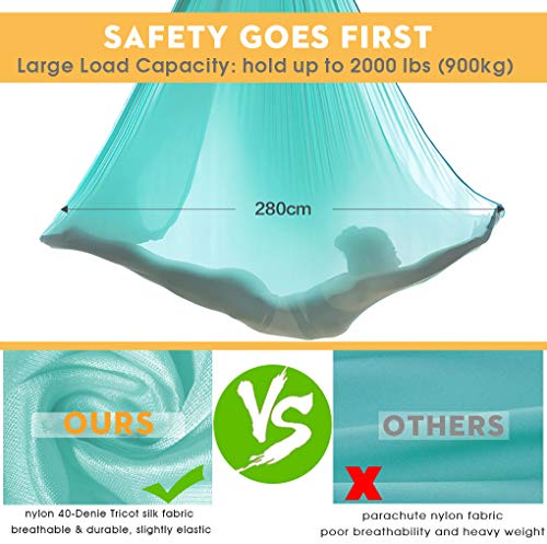 ✔ HIGH QUALITY YOGA SWING MATERIAL: Our Aerial yoga trapeze swing is made of 100% nylon 40-Denie Tricot silk fabric with slightly stretchy. Unlike the parachute nylon fabric on the market, our antigravity yoga hammock is strong enough to hold up to 2000 lbs (900kg). Thanks to its nylon mesh fabric, it is soft, breathable & slightly elastic, but it is strong & durable, suitable for both beginner, advanced aerial pilates & yoga practitioners. Size: 197in/5m/5.5 yards (L) x 110in/2.8m/3 yards(W)