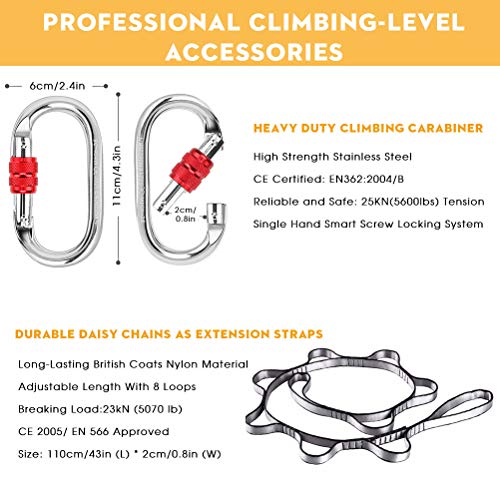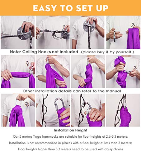 ✔ EASY TO SET UP: An installation instruction is included in the package. It can be easily attached to your existing aerial rigging, ceiling suspension hooks, door frame, exposed beam or tree branch. Package included: 1 x yoga silk, 2 x Titanium steel carabiners for hanging(load bearing:25kN/5600lbs), 2 x daisy chains extension straps (105cm*1.5cm, load bearing:23kN/5070 lb)for adjusting the height of the set, 1 x storage bag, 1 x User Manual