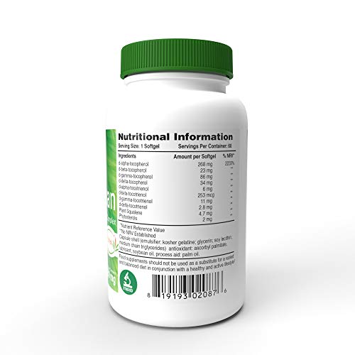 Serving size: 1 Softgel Amount Per Serving% Daily Value Vitamin E (as dl-alpha tocopheryl acetate)† 400 IU1333% Gamma Tocopherol 100 mg* Delta Tocopherol 40 mg* Beta Tocopherol 3 mg* Mixed Tocotrienols (EVNOL™ Tocotrienols) 20 mg* D-alpha Tocotrienol 5.8 mg* D-beta Tocotrienol 253 mcg* D-gamma Tocotrienol 11.2 mg* D-delta Tocotrienol 2.8 mg* * Daily Value not established. † 200 IU as D-alpha tocopherol acetate 100 IU as D-alpha tocopherol acid succinate 100 IU as D-alpha tocopherol Other Ingredients: Gelatin, medium chain triglycerides, glycerin, soy lecithin, high P.C. soy lecithin, purified water and ascorbal palmitate. Contains Soy Free of: Starch, sugar, sodium, preservatives, yeast, corn, milk products and artificial colors-flavors-dyes.