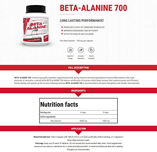 BETA-ALANINA 700 limits the acidification of muscle fibers, which translates into an increase in their explosive strength and efficiency during exercise and accelerates the complete post-workout regeneration of the body. BETA-ALANINE 700 is recommended in all sports, both aerobic and anaerobic.