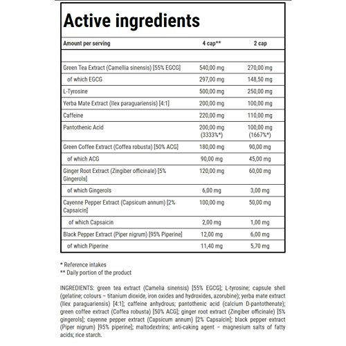 Clenburexin: Green Tea Extract, L-Tyrosine, Yerba Mate Extract, Caffeine, Panthothenic Acid, Green Coffee Extract, Ginger Root Extract, Cayenne Pepper Extract, Black Pepper Extract L-Carnitine Complex: l-carnitine tartrate, Vitamin B6, Chrome