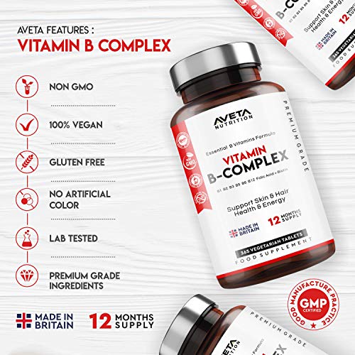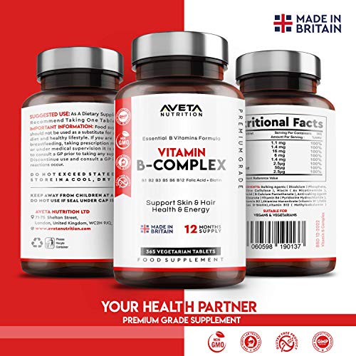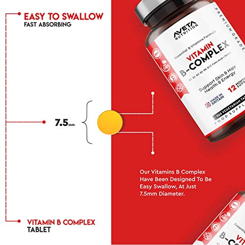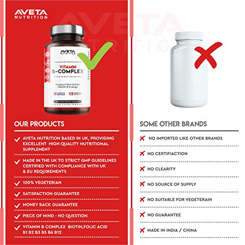 Why Buy Aveta Vitamin B Complex ✔Aveta Nutrition B Complex Advanced Formula Our vitamin B complex contains all eight vitamin B’s. This includes Thiamine (Vit B1), Riboflavin (Vit B2), Niacin (Vit B3), Pantothenic acid (Vit B5), Pyridoxine Vit B6, Biotin (Vit B7), Folic Acid (B9), Folate Vit B12 ✔UK PRODUCED – Produced to the highest manufacturing standards in the world. ✔100% MONEY BACK GUARANTEE – No questions asked ✔ADVANCED PREMIUM FORMULA – HIGH QAULITY EVERY DAY SUPPLEMENT- Our supplement contains all 8 B vitamins, with 6 months supply, it has more quantity then of other brands. HIGH QUALITY INGREDIENTS are ONLY USED IN OUR PRODUCTS. One easy to swallow tablet