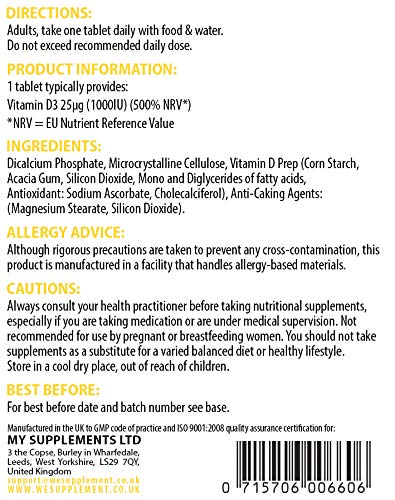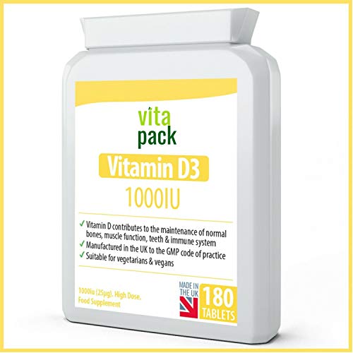 Vitamin D3 1000iu (25µg) Cholecalciferol – 180 Vegan Tablets – for Immune Support, Bone Health & Teeth – UK Made