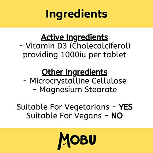 Vitamin D3 (Cholecalciferol) providing 1000iu per tablet, Microcrystalline Cellulose, Magnesium Stearate