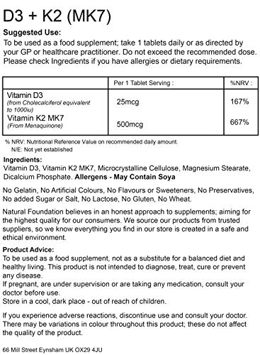 Vitamin D3 1000iu & K2 MK7 500mcg Tablets Supplements for Bone and Muscle Health | Natural Foundation Supplements (1000…