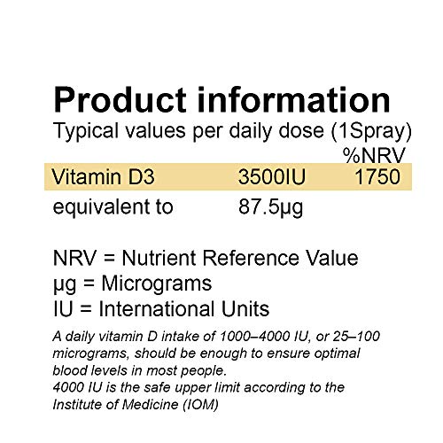 RECOMMENDED DAILY VALUE – We offer 20ml of Vitamin D3 Spray 3500U. That is TWICE the amount of competing brands. This gives you approximately 120 actuations – enough for 4 months.