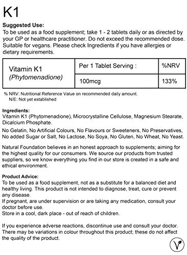 Vitamin K1 Tablets 100mcg High Strength Vitamin K1 Phytomenadione | Natural Foundation Supplements (30)