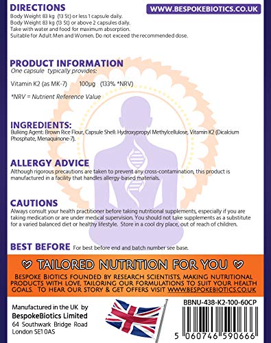 One capsule typically provides: Vitamin K2 (as MK-7)100µg (133% *NRV) *NRV = Nutrient Reference Value. Ingredients: Brown Rice Flour, Capsule Shell: Hydroxypropyl Methylcellulose, Vitamin K2 (Dicalcium Phosphate, Menaquinone-7).