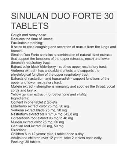 Sinulan Duo Forte is a rich combination of plant extracts that aids the functions of the respiratory tract – nose, sinuses and bronchi, facilitating the secretion . Tropaeolum majus (Nasturtium) stem extract and Horseradish (Armoracia rusticana) root extract enhance the function of the upper and lower respiratory tract. Black elderberry (Sambucus Nigra) blossom extract, promotes immunity and reduces irritation in the upper respiratory tract. Lupine (Verbascum thapsus) blossom extract and Vervain (Verbena Officinalis) stem extract relieve the condition of the larynx and vocal cords, also contributing to natural immune defenses. Yellow Gentian (Gentiana lutea) root extract helps to increase vitality and tone. The product is available in a convenient pack of 30 tablets. Suitable for: Adults and children over 6 years. Usаge: The standard dosage of Sinulan Duo Forte for children 6 to 12 years is 1 tablet, and for adults and children 12 and older – 2 tablets once a day. 1 tablet contains: Tropaeolum majus (Nasturtium) stem extract – 171.4mg; Horseradish (Armoracia rusticana) root extract – 48mg, Black elderberry (Sambucus Nigra) blossom extract – 25mg, Vervain (Verbena Officinalis) stem extract – 25mg, Yellow Gentian (Gentiana lutea) root extract – 25mg; Lupine (Verbascum thapsus) blossom extract – 25mg. Warnings: Sinulan Duo forte is a nutritional supplement. It is not a substitute for a varied diet. Do not exceed the recommended daily dose. Do not use in case of hypersensitivity to any of the ingredients. Keep out of the reach of children!
