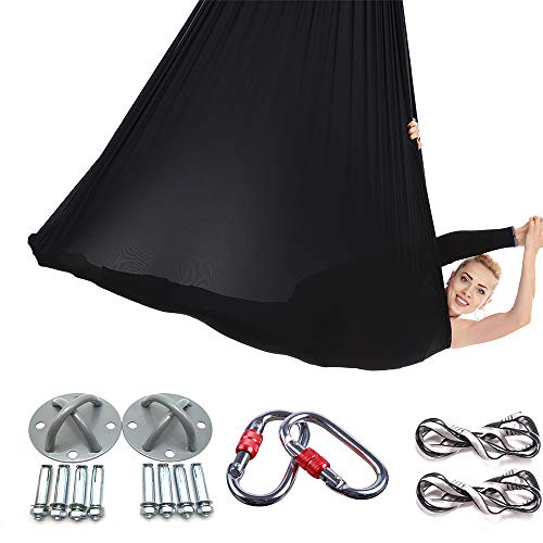 The aerial hammock kit comes with aerial silk fabric (16 feet length, 9.18 feet width), 2 steel carabiners, 2 extension straps, 2 Stainless steel Hanging tray + 8 Expansion screw, This kit can be used with hanging points of as high as 11 feet with very strong weight limit of 500kg ensuring safety and peace of mind.