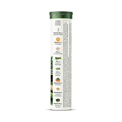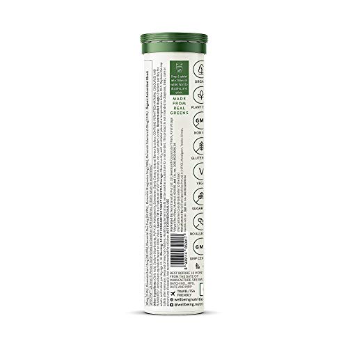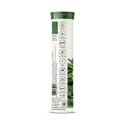 Wellbeing nutrition daily greens – organic plant superfood effervescent tablets are the most convenient and delicious way to get a daily dose of greens, fruits veggies, and herbs. Crafted with an organic blend of 15 essential and alkalising real greens, straight from the farm. Spinach, kale, aloe vera, wheatgrass, brussel sprout, alfalfa, oregano, spirulina, chlorella, broccoli, ashwagandha, moringa, basil and potent blend of over 30+ antioxidant-rich superfoods including blueberry, raspberry, cherry, apple, acai, turmeric, cinnamon, green tea, carrot , green coffee bean and many more. Each tablet delivers 100% daily value of 12+ wholefood multi-vitamins , minerals and electrolytes like vitamin c, vitamin b3, vitamin b5, vitamin b12, vitamin b6, fibre, iron, zinc, sodium, potassium,manganese, calcium,vitamin d, vitamin e and many more phytonutrients all derived from organic greens & fruits. Daily greens help to boost immunity & metabolism, fight free radicals, cures acidity and bloating, boost digestive enzymes with plant probiotics, decrease inflammation, make your skin glow, detoxes the body and aids in weight loss, protects your brain and relieves stress. All our products are free of gluten, wheat, dairy, sugar, preservatives, allergens, and colors. Safe for vegan and diabetics. It can be taken up to 3 times a day for adults and once a day for children between 4-8 years. Enjoy a convenient and delicious way to get your daily dose of green nutrition.