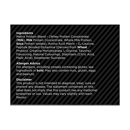 Description: Matrix Whey Protein utilises high quality protein from multiple sources to create a supplement that not only delivers a rapid release of amino acids, but also provides the body with prolonged access to these essential muscle building ingredients. Matrix Whey isn’t a product that has ignored carbohydrates either; we have included 16g of fast acting carbs in order to further facilitate muscle recovery and development after exercise. Ingredients: Matrix Protein Blend – (Whey Protein Concentrate WPC80, Milk Protein Concentrate MPC85 – high in Micellar Casein, Whole Milk Protein, Soya Protein Isolate SPI90.) Amino Acid Matrix (L-Leucine, L-Glutamine, Creatine, L-Glycine, Taurine). Flavouring, Natural Colourings, Stabilisers (Citric Acid, Malic Acid), Sweetener: Sucralose. Directions: Mix 1 scoop (45g) with 300-400ml of water or milk in a shaker or blender. Adding powder to fluid is the best way to create a protein shake. Consume 1-3 servings per day depending on training goal, ideally consume a serving immediately after training. Per Serving: Product is: Matrix Whey Values based on: Per 45g serving Energy (kcal/g) 172 Protein (g) 23 Carbohydrates (g) 16.3 Of which sugars 15 Fat (g) 2.2 Of which saturates 0.7 Fibre (g) 1.3 Sodium (mg) 144 Whey Matrix Protein Amino Acid profile per 100g: L-Isoleucine* 3688mg L-Leucine* 6082mg L-Lysine 4941mg L-Methionine 1210mg L-Phenylalanine 1856mg L-Threonine 4240mg L-Tryptophan+ 952mg L-Valine* 3442mg L-Cystine 1426mg Glutamic Acid 10730mg L-Histidine 1050mg L-Proline 3830mg L-Tyrosine 1658mg L-Alanine 2917mg L-Aspartic Acid 6424mg L-Glycine 1066mg L-Serine 2992mg