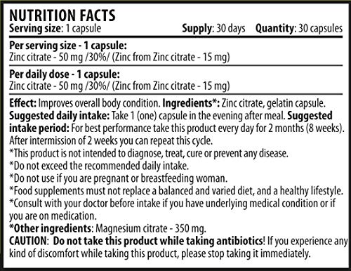 Zinc citrate – 50mg (30%) – ( zinc from zinc citrate – 15mg).